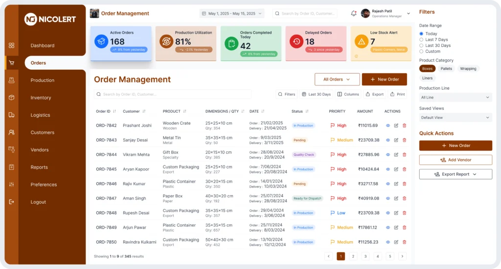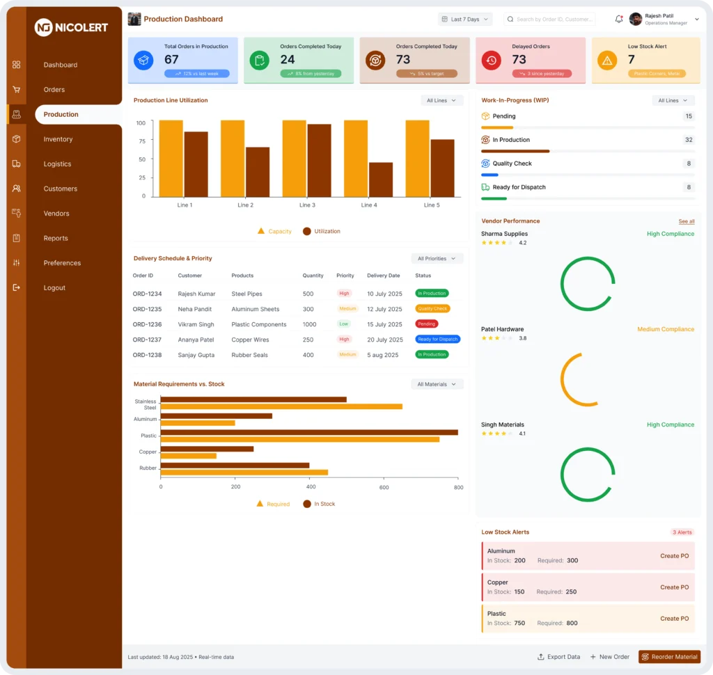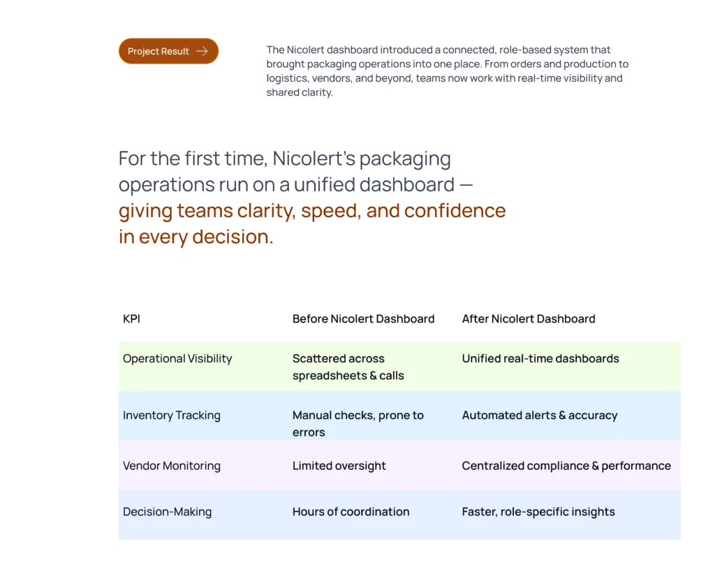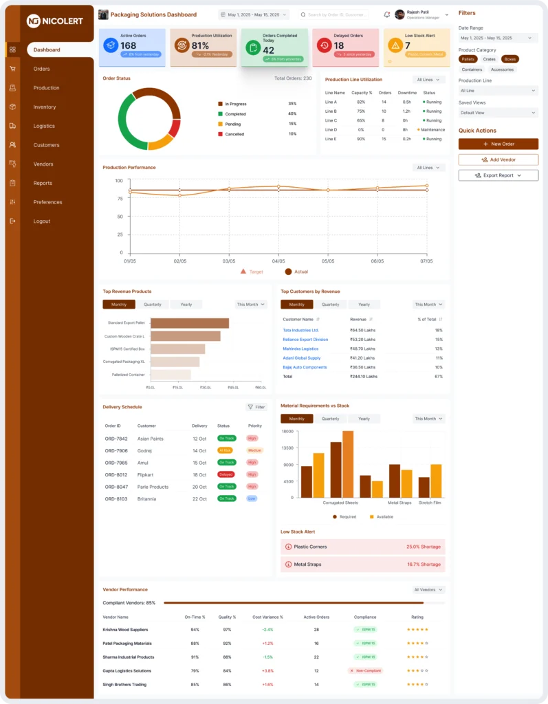 We built Nicolert’s first all-in-one dashboard suite for packaging operations. Designed to replace scattered spreadsheets and manual tracking, it connects orders, production, inventory, logistics, customers, vendors, and more into one source of truth. The dashboard delivers real-time visibility, clear insights, and faster decisions for every part of packaging operations.