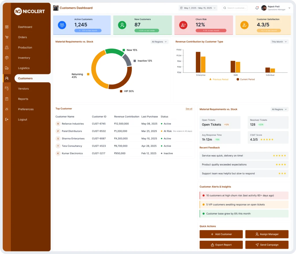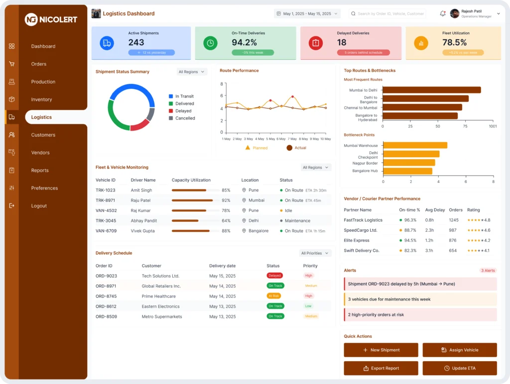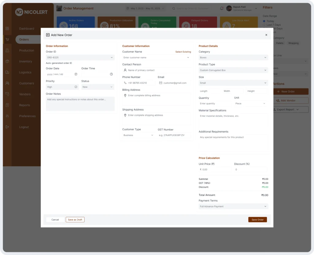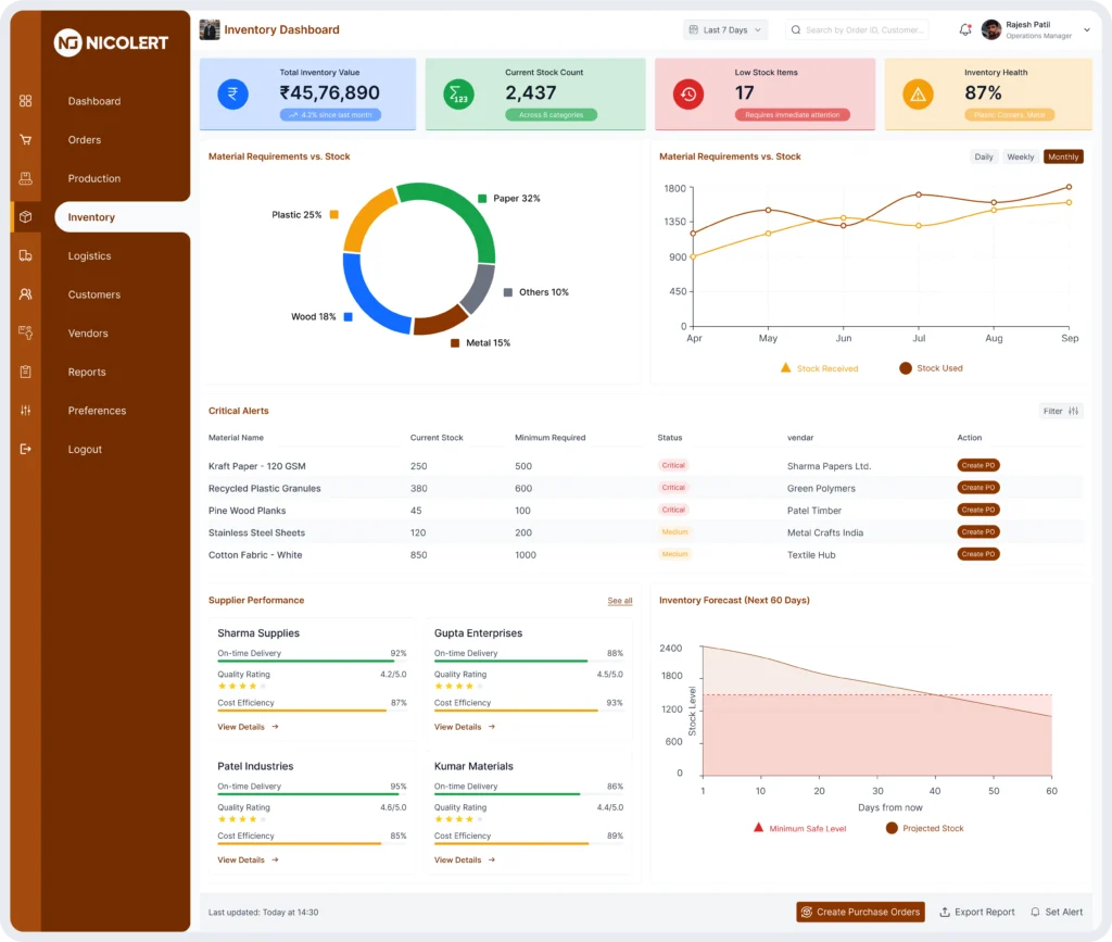 We built Nicolert’s first all-in-one dashboard suite for packaging operations. Designed to replace scattered spreadsheets and manual tracking, it connects orders, production, inventory, logistics, customers, vendors, and more into one source of truth. The dashboard delivers real-time visibility, clear insights, and faster decisions for every part of packaging operations.